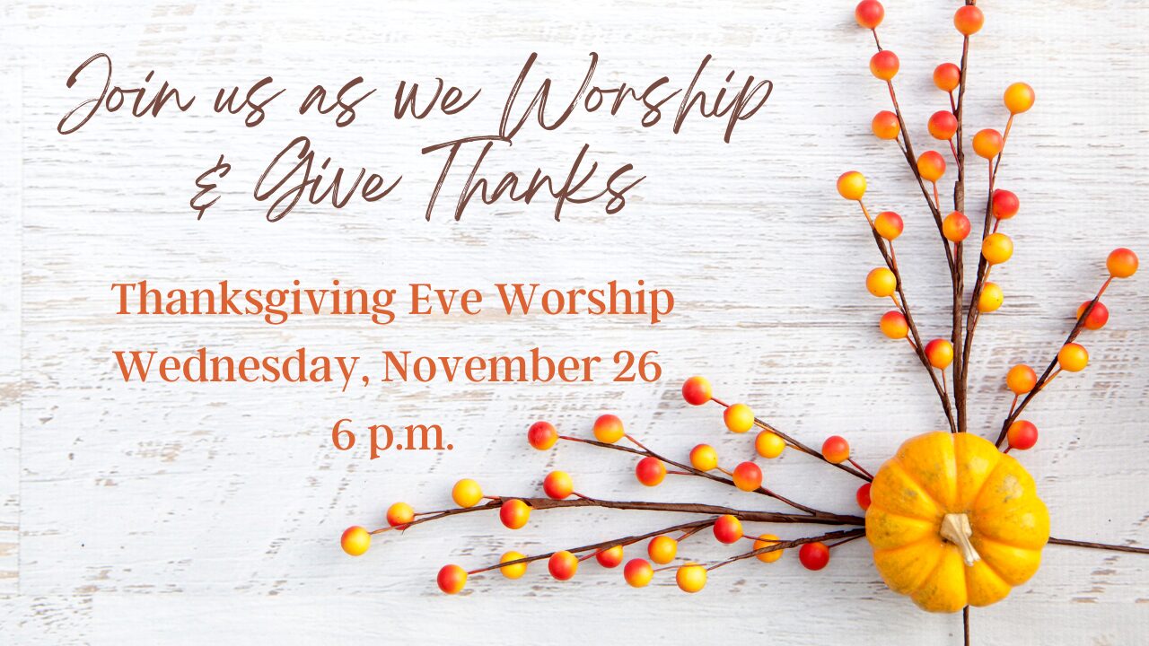 We hope that you will join us on Thanksgiving Eve @ 6pm as we Worship the Lord together and give thanks for our many blessings.